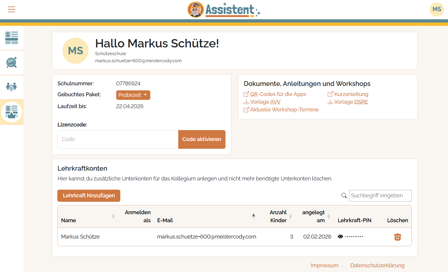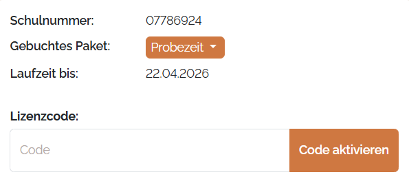Hier siehst du die Kundennummer ("Schulnummer") deiner Schule bei Meister Cody, das gebuchte Paket und wie lange euer Konto mit diesem Paket noch freigeschaltet ist. Solltest du einen Lizenzcode vorliegen haben, dann kannst du ihn hier eingeben, auf "Code aktivieren" klicken, um neue Funktionen zu aktivieren oder die Laufzeit zu verlängern.