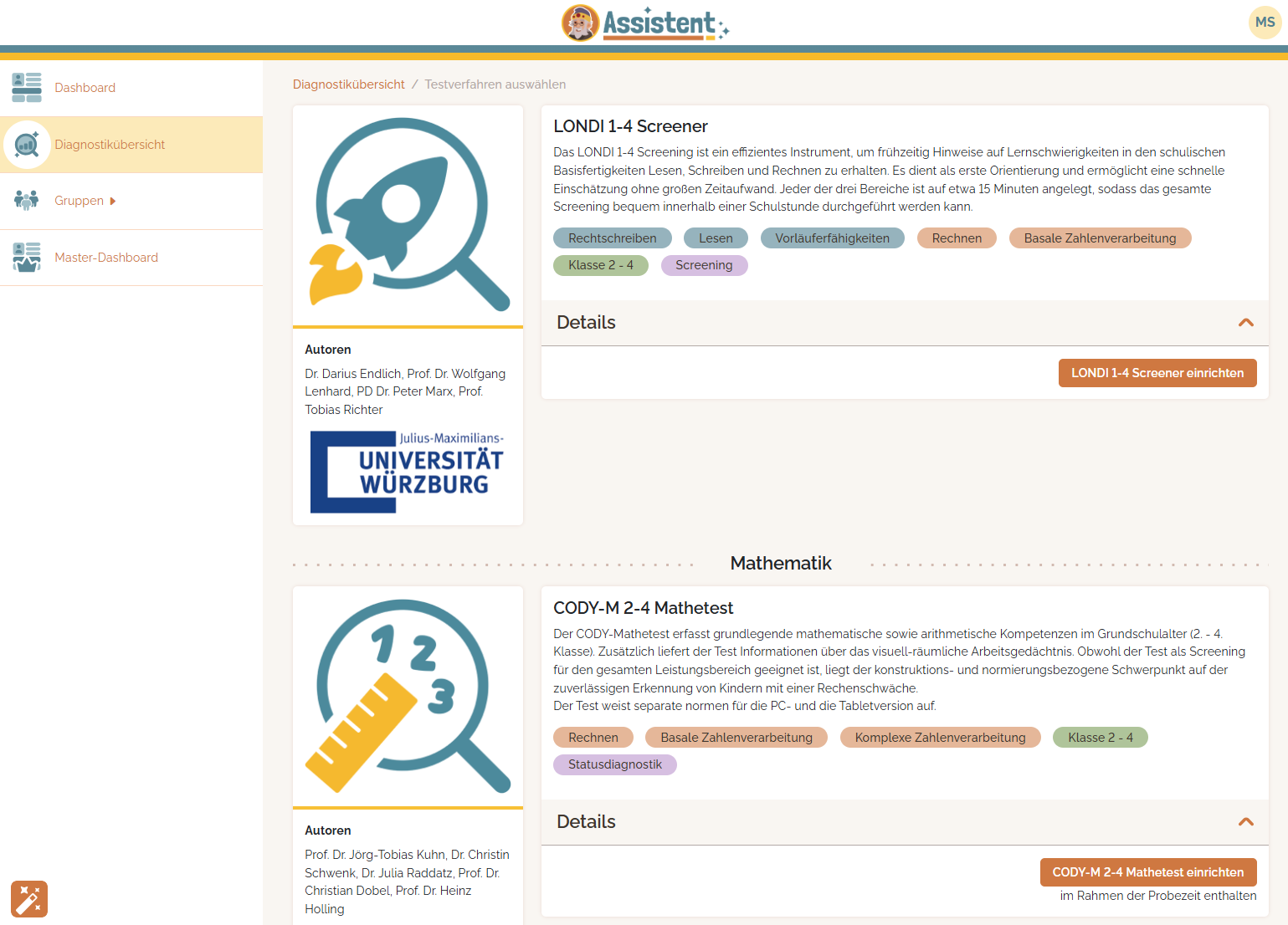 Hier findest du immer alle Diagnostikverfahren, die aktuell im Assistenten für deine Schule zur Verfügung stehen. Wähle nun z.B. den LONDI-Screener aus, indem du auf "LONDI 1-4 Screener einrichten" klickst: