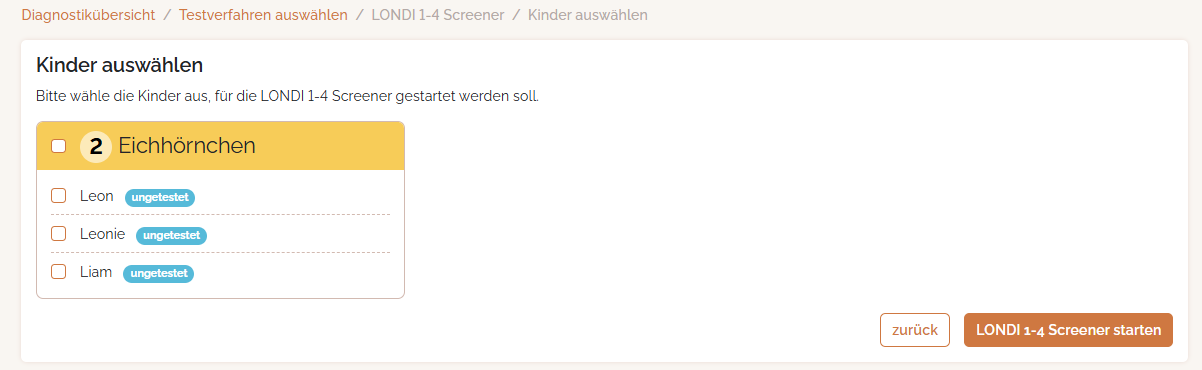 Du siehst hier nun alle Gruppe inkl. der darin befindlichen Kinder. Du kannst nun das LONDI-Screening für die gesamte Gruppe aktivieren, indem du einen Haken neben der 2 setzt, oder du wählst einzelne Kinder aus.