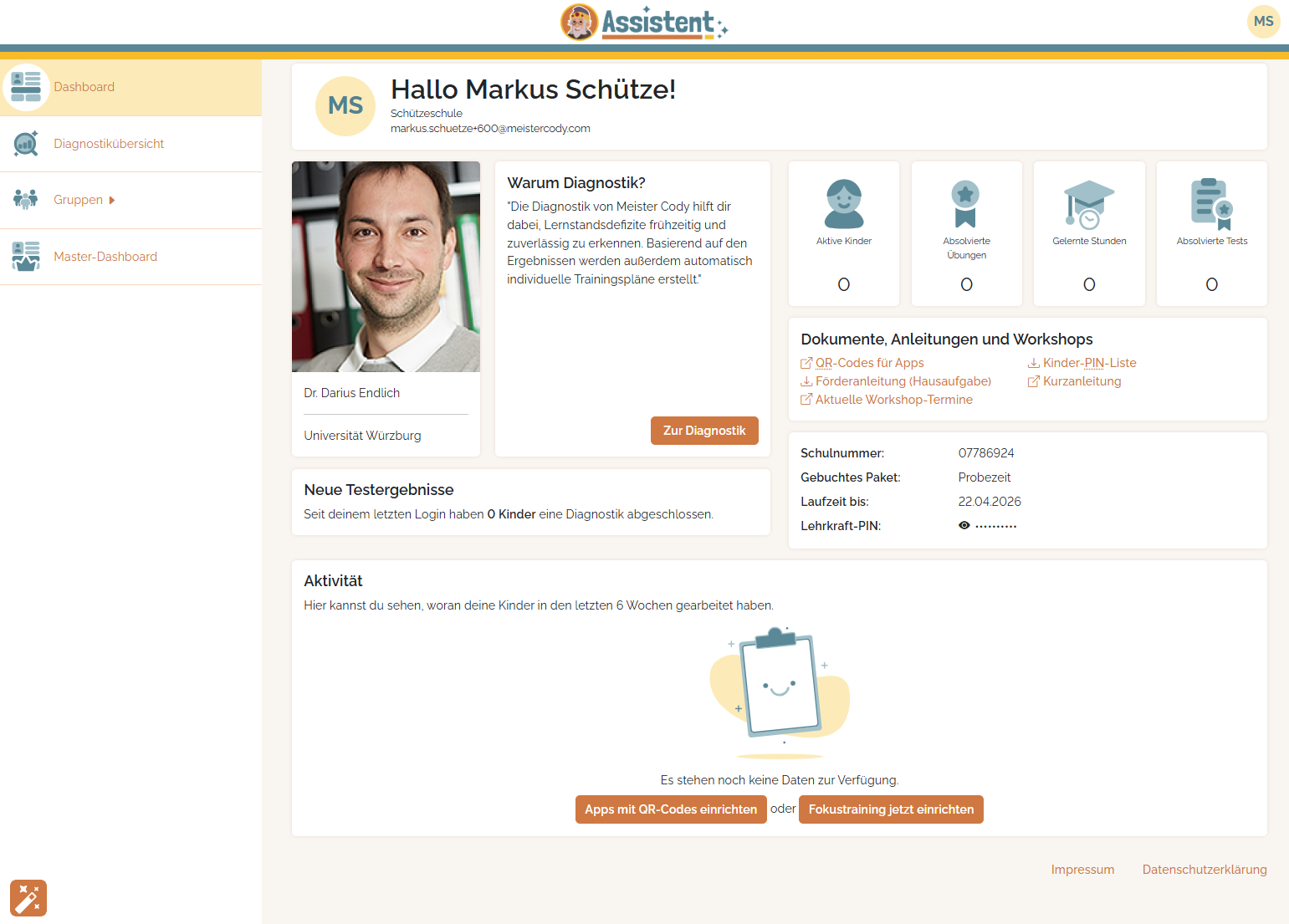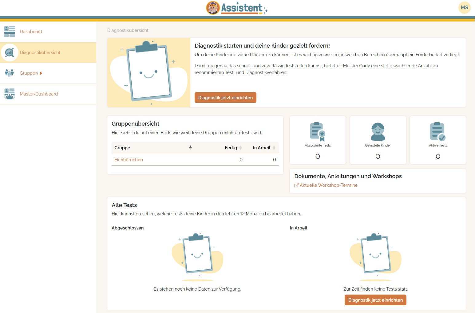 Nachdem du nun deine erste Gruppe mit Kindern angelegt hast, wird es Zeit für eine Diagnostik. Melde dich im Lehrkraft-Dashboard an und die erhältst folgende Ansicht: