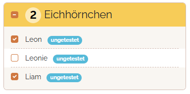 Hier siehst du nun unter "Gruppenübersicht", dass für die Gruppe "Eichhörnchen" aktuell zwei Testungen aktiv sind. Falls du die Testung für eines der Kinder abbrechen möchtest, klicke auf das Papierkorbsymbol ganz rechts.