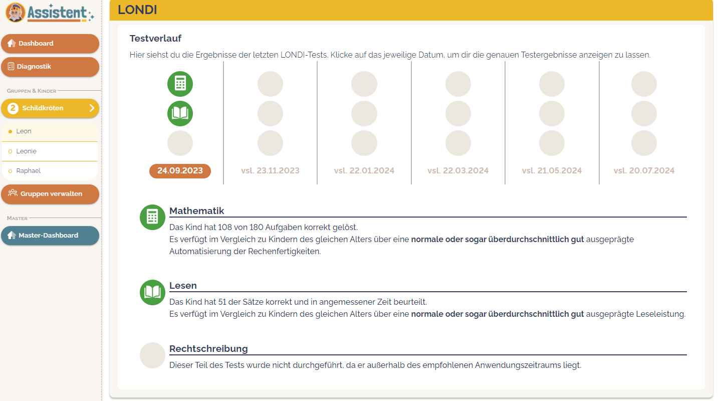 Nun siehst du die Profilseite von Leon und zwar den Bereich für das LONDI-Screening. Du siehst den Eintrag für den 24.09.2023 und darunter die Ergebnisse. Für jede neue Durchführung wird ein neuer Eintrag generiert, sodass du den Verlauf über mehrere LONDI-Screenings hinweg verfolgen kannst.