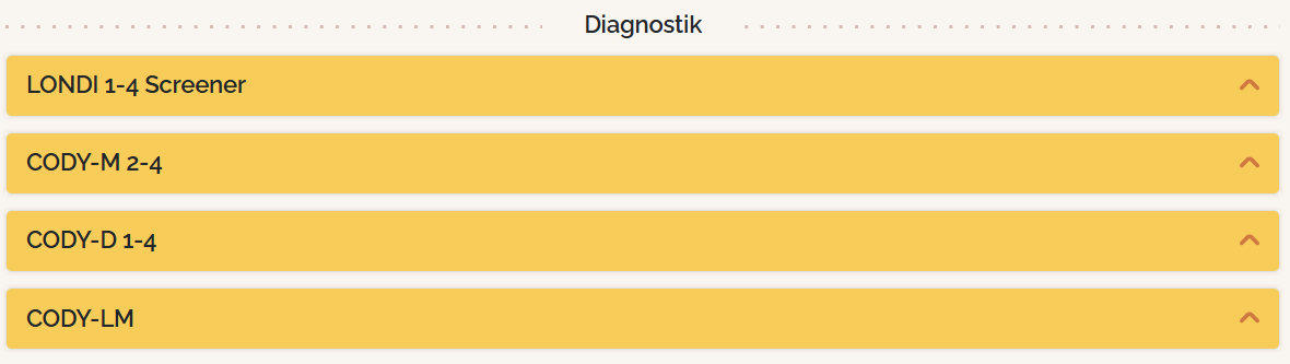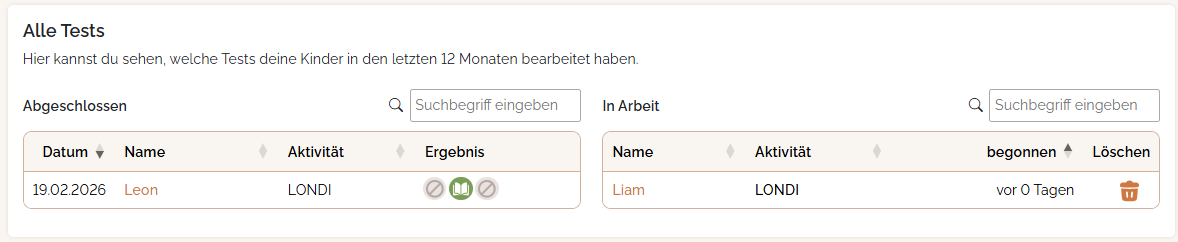 Leon hat nun die Lese-Komponente des LONDI-Screenings abgeschlossen und unter "Alle Tests" er ist von "In Arbeit" nach links zu "Abgeschlossen" gewandert: