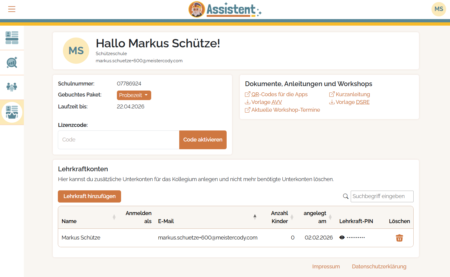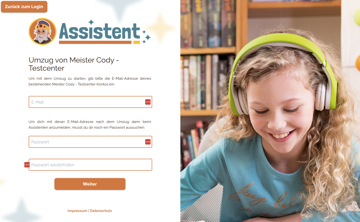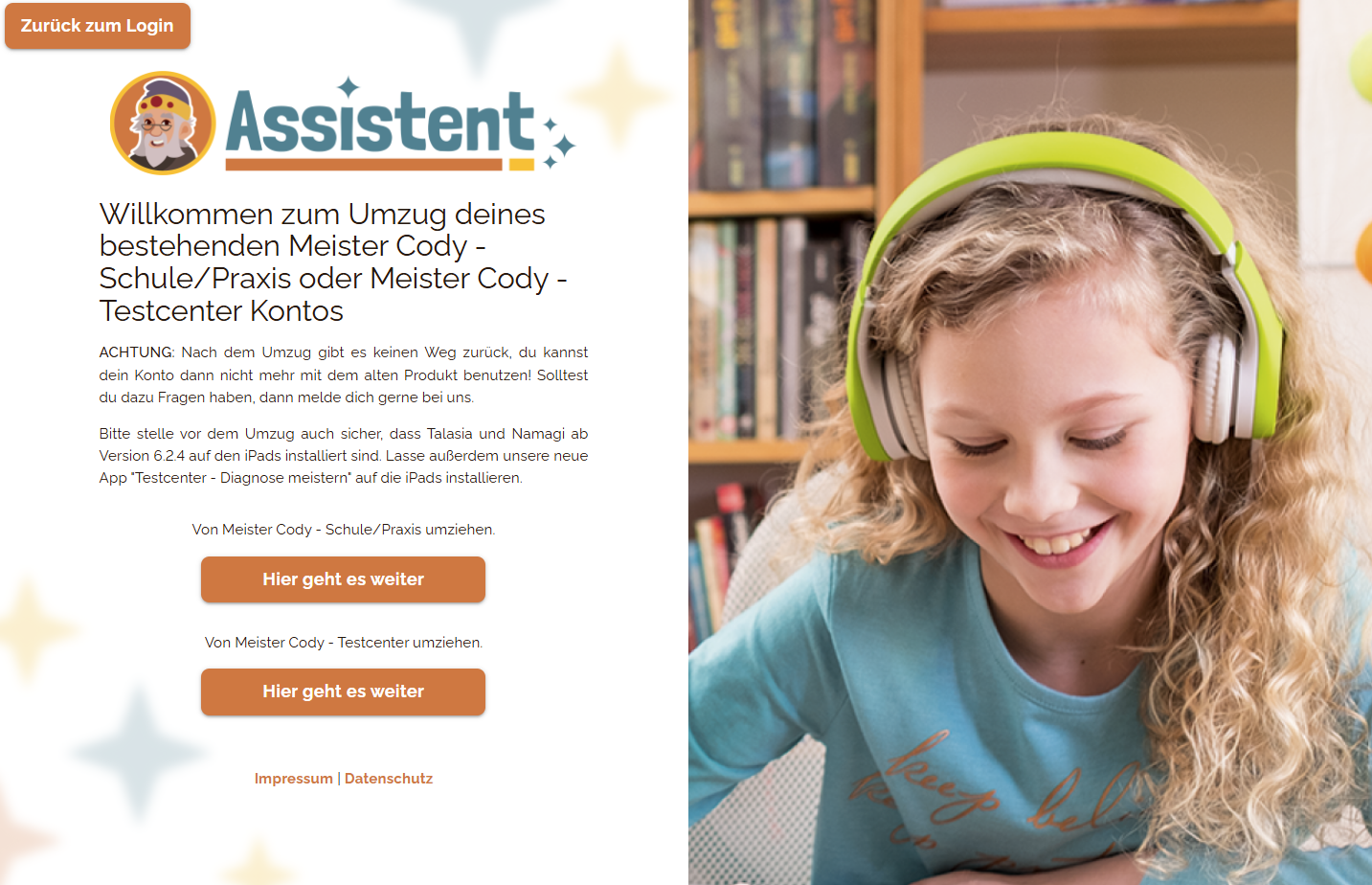 Wenn du bisher mit "Meister Cody - Testcenter" gearbeitet hast, kannst du mit allen angelegten Kindern und durchgeführten Tests zum Assistenten umziehen. Das ist ganz einfach!