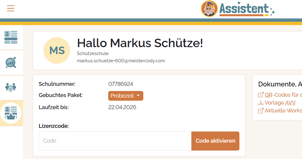 Solltest du einen Code für die Freischaltung einer Funktion (z.B. für die Nutzung des CODY-M oder von Talasia) vorliegen haben, dann kannst du ihn auf dem Master-Dashboard einlösen.