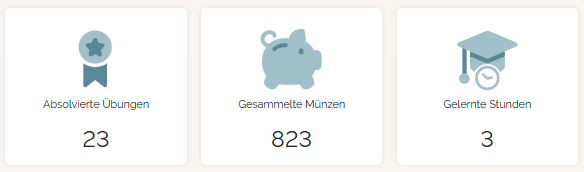 Diese Box zeigt dir, wie viele Übungen Leon bereits abgeschlossen hat, wie viele Münzen der dabei gesammelt hat und wie viele Stunden er mit dem Training verbracht hat.