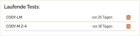 Dies sind die Testverfahren, die für Leon aktiviert wurden, die er aber noch nicht abgeschlossen hat.