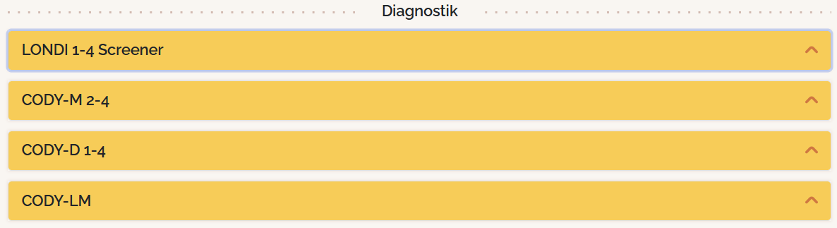 Hier siehst du die Diagnostikverfahren, die für deine Schule freigeschaltet sind. Die Liste kann bei dir also anders aussehen als dieses Beispiel hier. Ein Klick auf eines der Verfahren öffnet die Detailansicht: