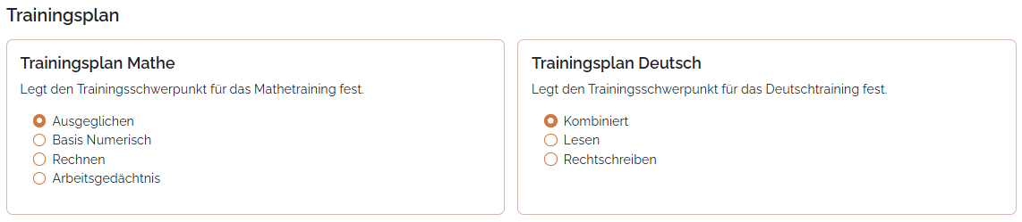 Hier kannst du selbst bereits vorbereitete Trainingspläne zu einzelnen Themengebieten auswählen. Solltest du mit einem Kind bereits einen CODY-M 2-4 Mathetest und/oder einen CODY-D 1-4 Deutschtest gemacht haben,. dann würde hinter einem der Trainingspläne der Hinweis "ermittelt vom CODY-M 2-4" oder "ermittelt vom CODY-D 1-4" erscheinen. Falls du manuell einen anderen Plan wählen solltest ist das für dich eine Erinnerung daran, welcher Plan über die Diagnostik erstellt wurde, falls du wieder auf diesen Plan umstellen möchtest.