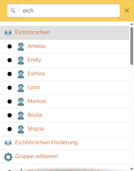 Die graue Markierung steht hier im Beispiel direkt auf der "Eichhörnchen"-Gruppe (du könntest dich mit den Pfeiltasten der Tastatur durch die angezeigte Liste bewegen) und kannst die Gruppenseite einfach durch Druck auf die ENTER-Taste aufrufen.