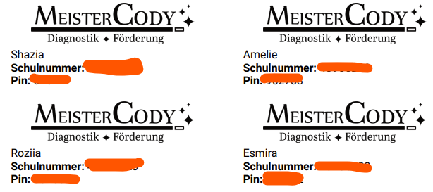 - Kinder-PIN-Liste: Du erhältst eine Liste der Kinder der Gruppe inkl. Schulnummer und PIN. Schneide kleine Zettelchen aus, die die Kinder in ihr Mäppchen legen und so immer alles parat haben, was sie zum Zugang zu den Meister Cody Apps benötigen.