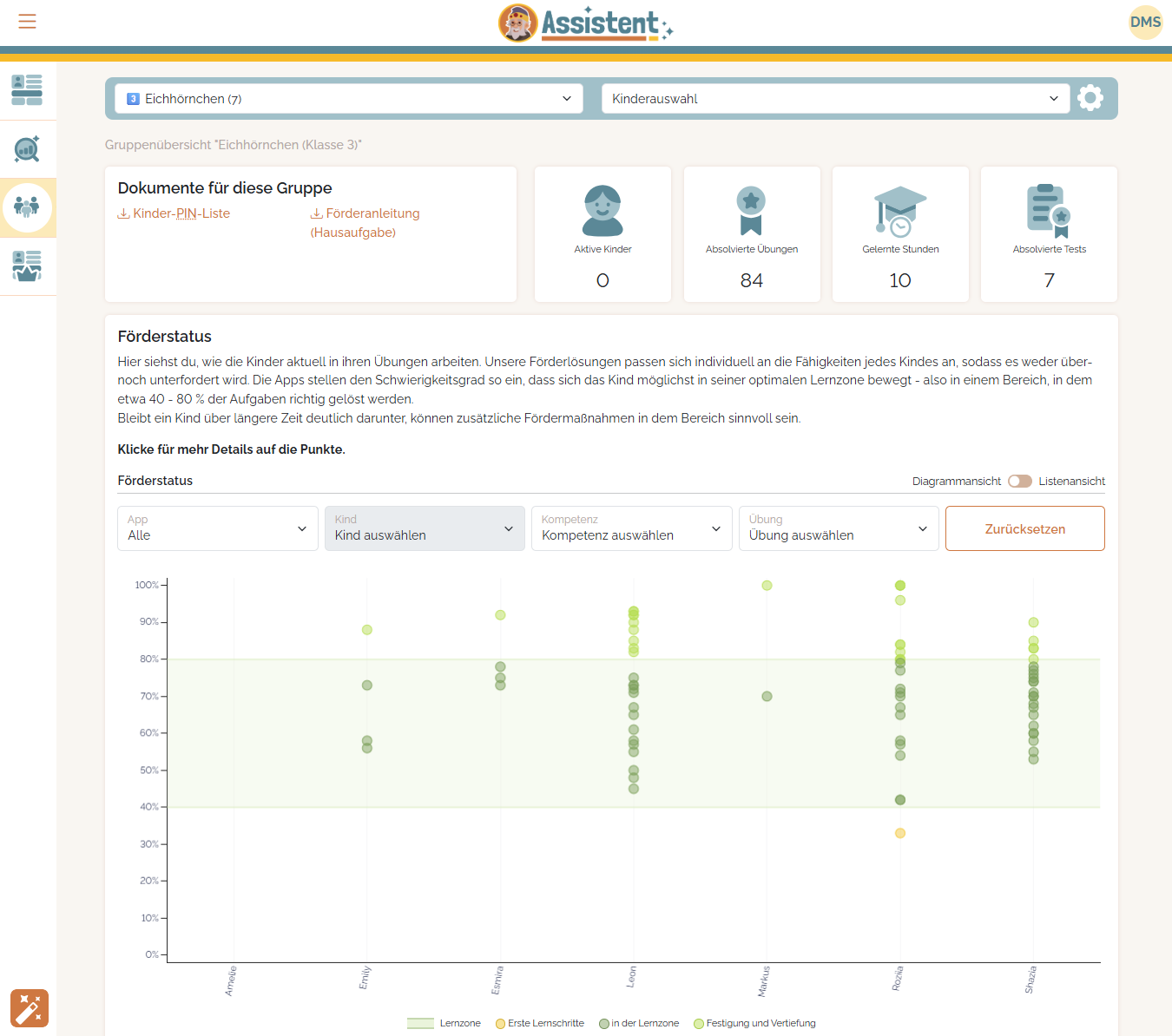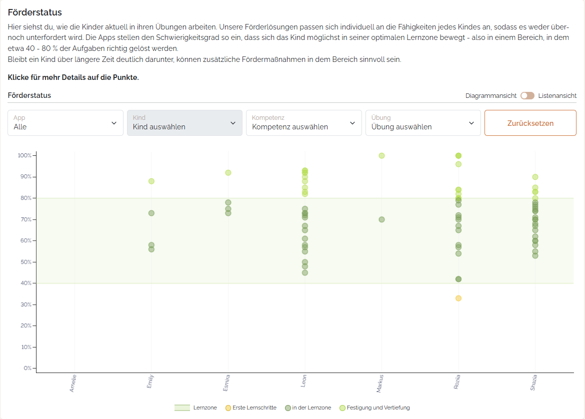 Die Kinder der Gruppe sind hierbei horizontal auf der X-Achse angeordnet, auf der vertikalen Y-Achse siehst du die Quote der richtigen Antworten, die ein Kind bei einer Übung gegeben hat. Jede Übung wird hierbei von einer kleinen "Bubble" repräsentiert.
