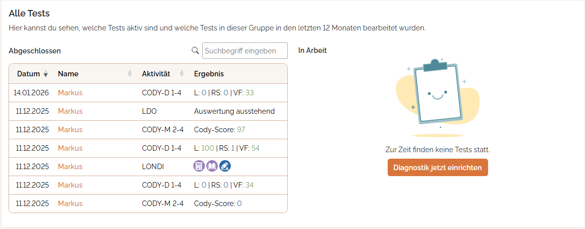 Hier siehst du eine Übersicht der Tests, die für die "Eichhörnchen"-Gruppe aktiv sind bzw. die abgeschlossen wurden. Es ist die selbe Ansicht, die du auch unter "Diagnostikübersicht" bekommst, aber eben nur auf die aktuelle Gruppe bezogen.