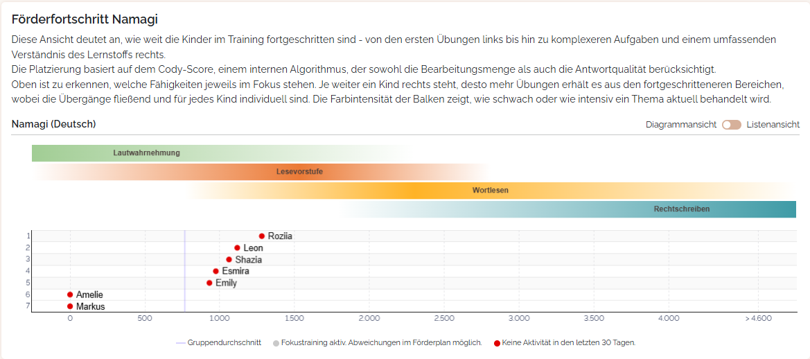 Zu Namagi bieten wir dir mit der Ansicht "Förderfortschritt Namagi" eine besonders übersichtliche Art und Weise, um zu verfolgen, wie sich deine Kinder entwickeln.
